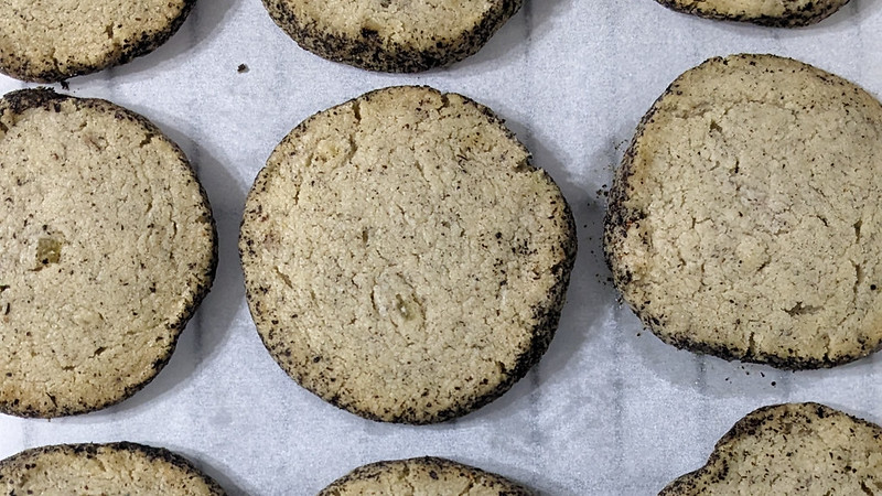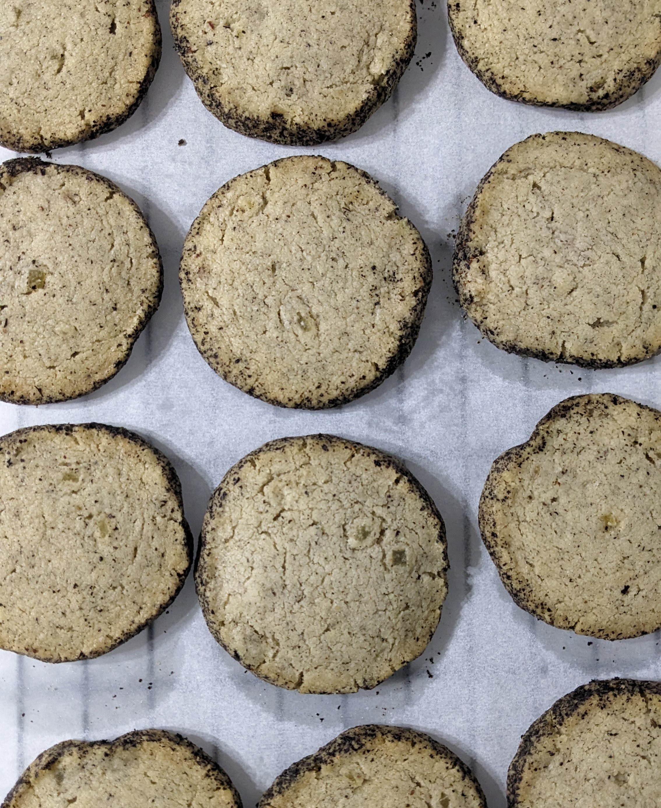 This made 12 cookies | Dough #1 – For the sugar-crusted log, set out a large piece of parchment, enough to wrap the dough. Combine the rest of the tea-sugar and the contents of the remaining 2 Lady Grey teabags. Spread out to make a bed. Add the dough and roll into a tight, smooth log, about 2 inches in diameter, and 10 inches long.
