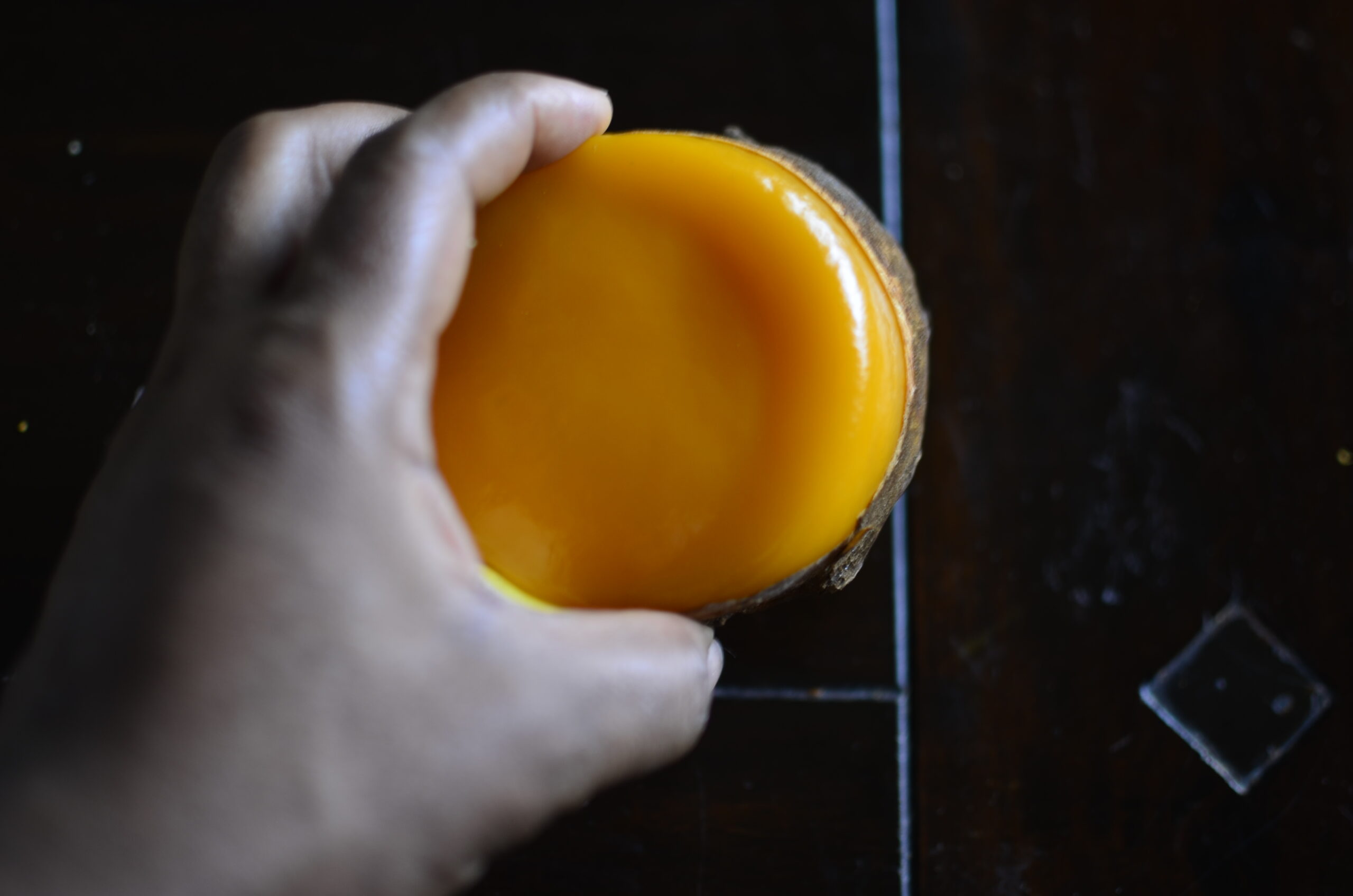 Once the ‘orange’ is revealed, it resembles a hard, somewhat oval ‘persimmon’ , with a creamy cap.